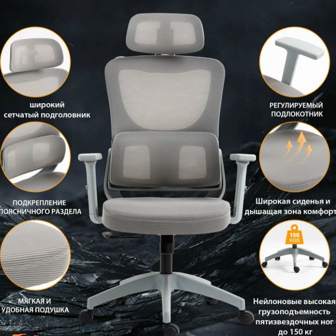 Спинка сетчатая - не потеешь. Откидывается до 120°, качается. Поясничный упор и подлокотники регулируются. Газлифт, металлическая крестовина. Нагрузка до 150 кг. Сиденье широкое.