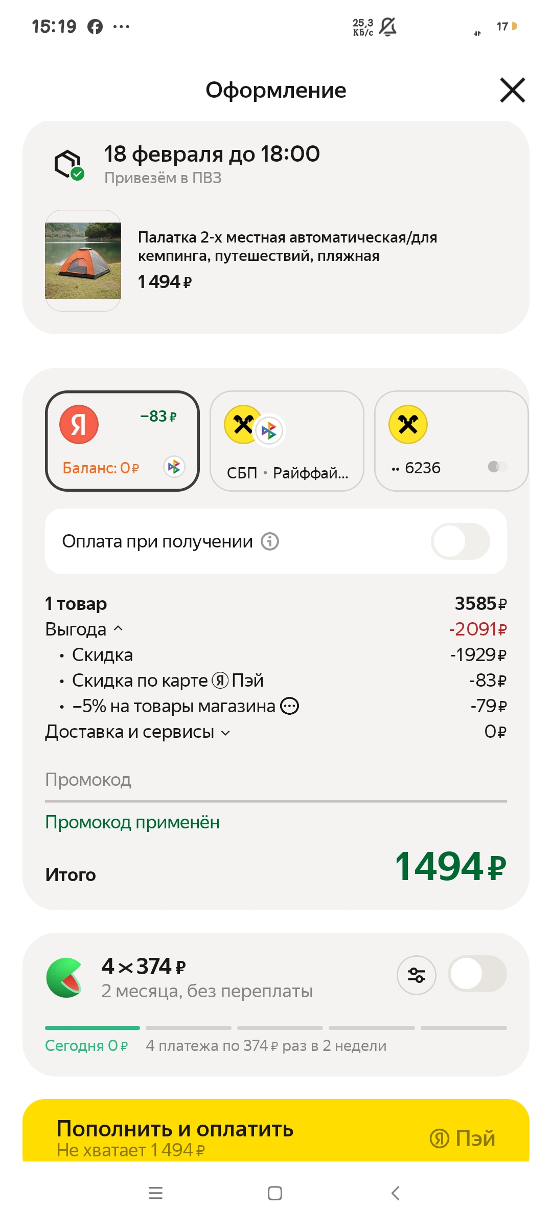 Отличная цена палатку на ЯМ. Двухместная, автоматическая - складывается и раскладывается быстро, без танцев с дугами. За 2144₽ по промокоду K4MVV87E.