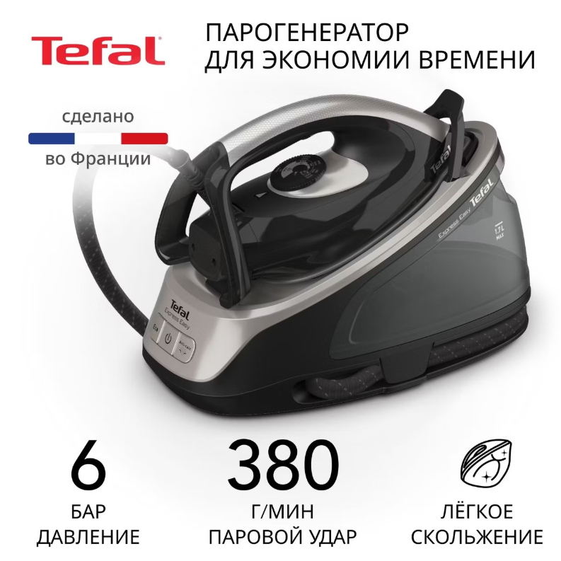 Списывай баллы в корзине. Парогенератор с давлением 6 бар и постоянной подачей пара 120 г/мин (паровой удар 380 г/мин) - справляется с плотными тканями и стойкими заломами. Подошва Xpress Glide скользит легко, резервуар 1,7 л позволяет долго не доливать воду. Есть вертикальное отпаривание