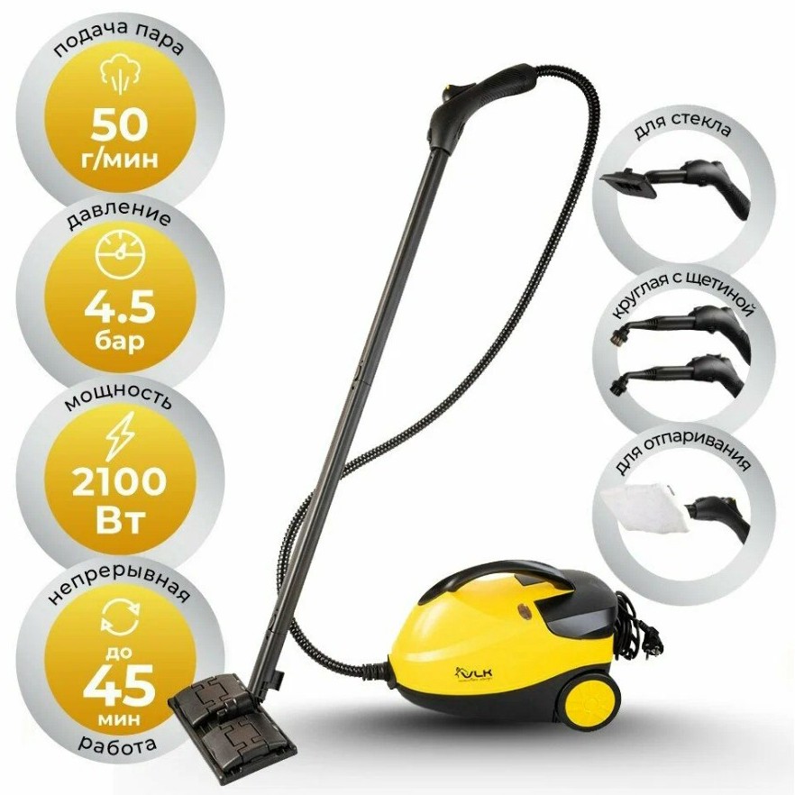 Мощность 2100 Вт, давление пара 4.5 Бар, резервуар для воды 1.5 л. Этого достаточно, чтобы спокойно пройтись по полу, плитке, швам, кухонным поверхностям и не доливать воду каждые пять минут. В комплекте много насадок - для пола, ковров, стекол, одежды и труднодоступных мест.