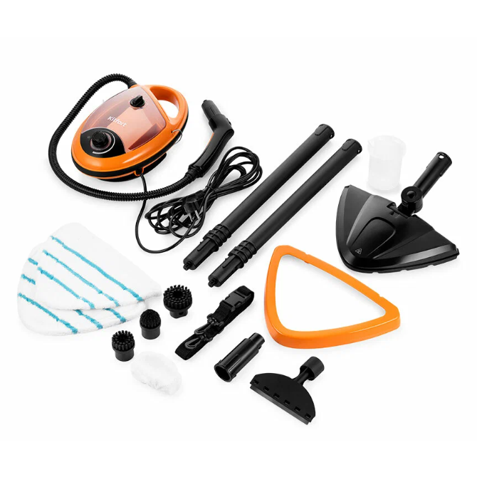 С ним можно мыть полы как паровая швабра, дезинфицировать поверхности, чистить окна и кафель, отпаривать одеждуу. Мощность 1300 Вт, подача пара регулируется, есть индикация работы. В комплекте куча насадок: щётки (малая, большая, коническая), скребок для стёкол, тряпки для пола, удлинительные трубки, даже ремень через плечо, чтобы носить. Всё разбирается, удобно хранить.