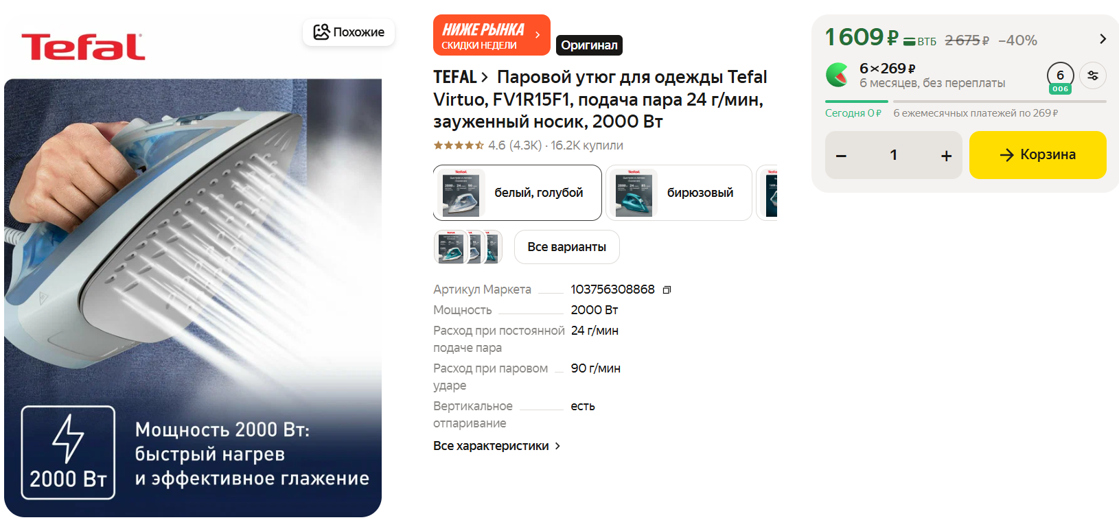 Хороший вариант за небольшие деньги. Мощность 2000 Вт, паровой удар 90 г/мин, вертикальное отпаривание пригодится для рубашек, блузок или штор, ещё можно освежить вещи, не снимая с вешалки.