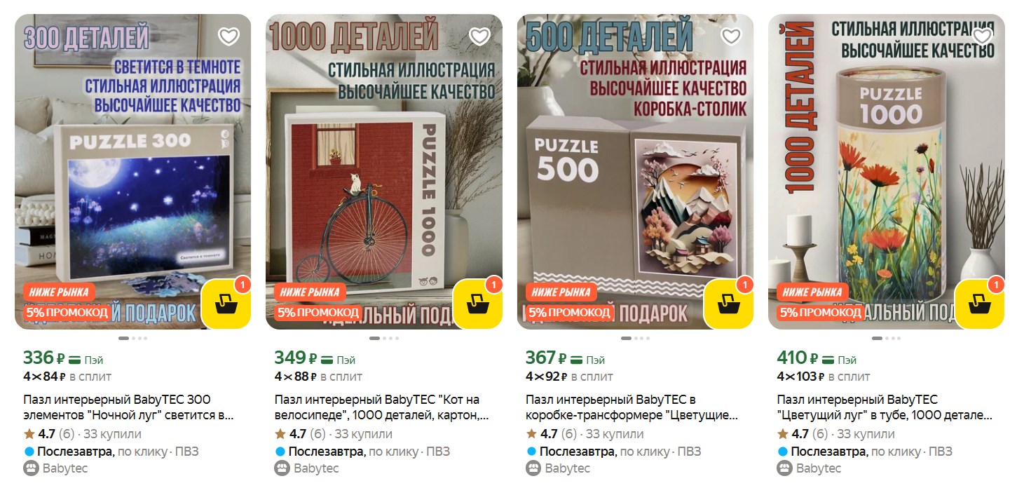 Друзья, для тех, кто любит собирать пазлы или ищет необычный подарок - посмотрите BabyTEC на Яндекс Маркете. Цены приятные, а некоторые наборы идут с бонусом +50 баллов Плюса за отзыв. Есть варианты, которые светятся в темноте - выглядит эффектно.