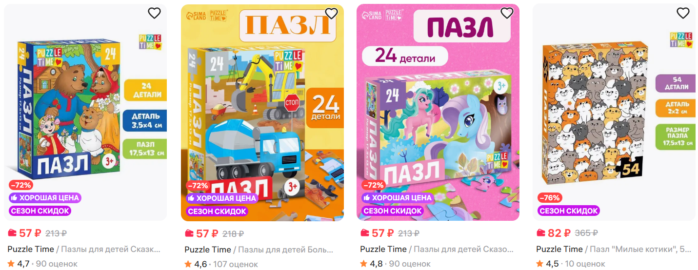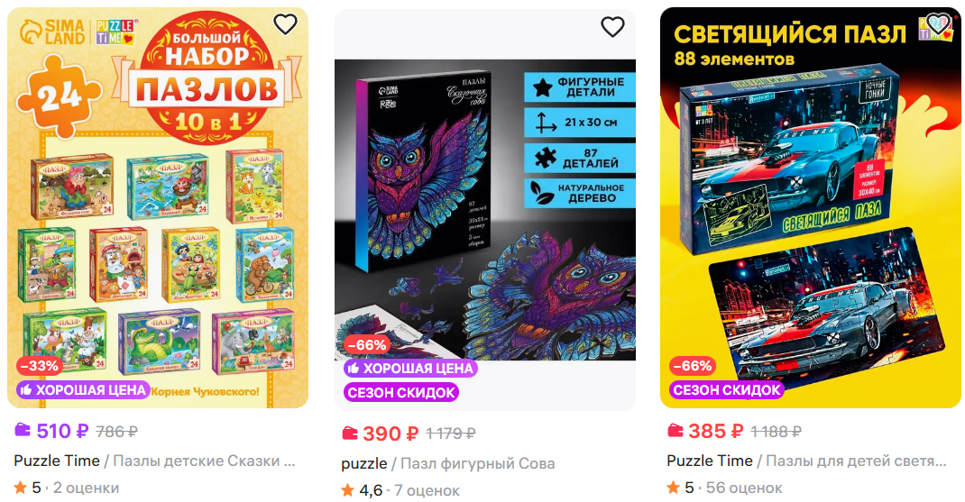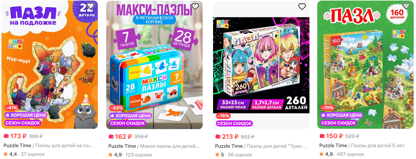 На Wildberries нашёл пазлы Puzzle Time от 57₽ при оплате WB Кошельком. Есть и маленькие детские, и посложнее, и фигурные, и светящиеся - для любого возраста найдётся. Хорошие варианты на подарки или просто для домашнего досуга.