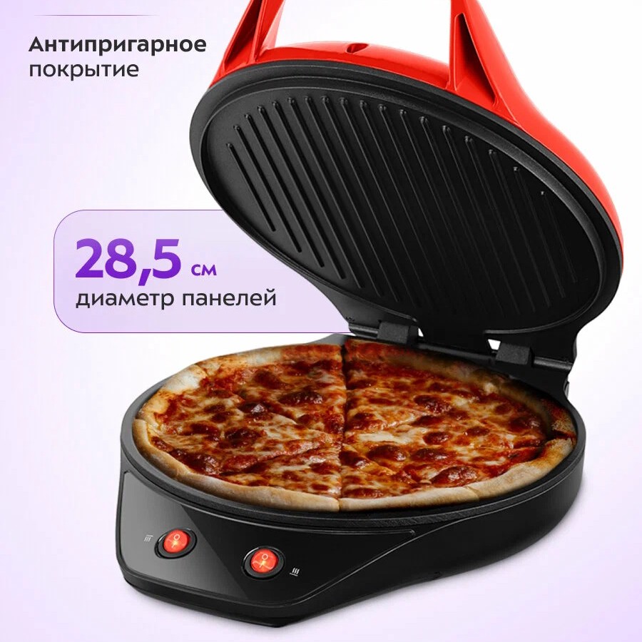 Оприбор для приготовления пиццы и других блюд в домашних условиях. Оснащён двумя нагревательными панелями с антипригарным покрытием, которые раскрываются на 180 градусов, что позволяет использовать его как полноценную открытую электрогриль-плиту.