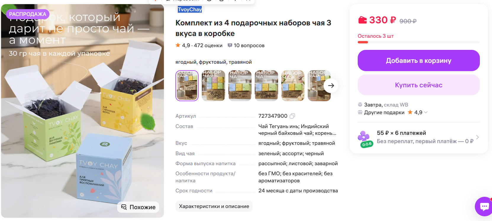 Отличный вариант для подарка коллеге, подруге или просто себе любимому. В наборе 3 вкуса, упаковка аккуратная — коробка или баночки с именем. Цены уже с учётом WB кошелька.