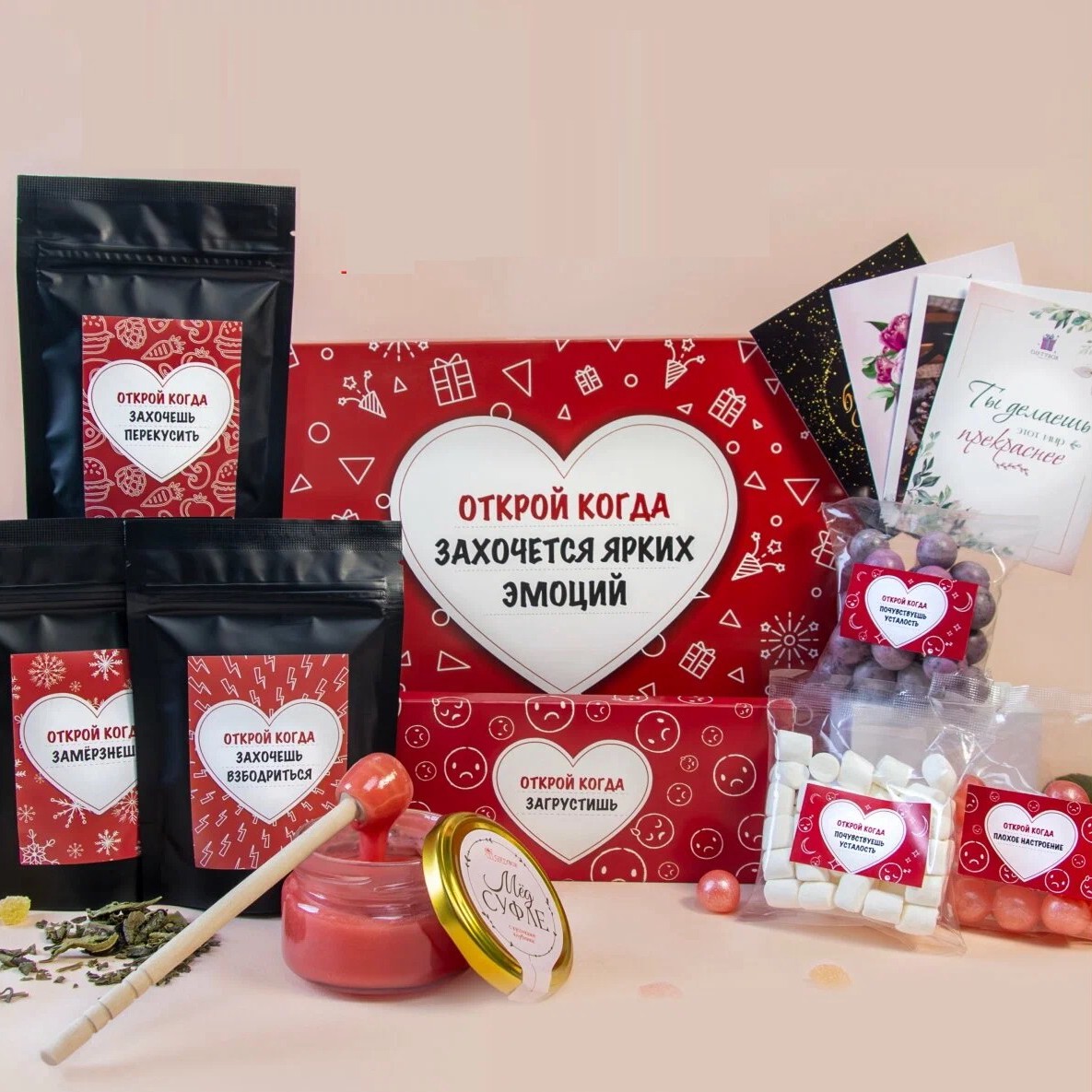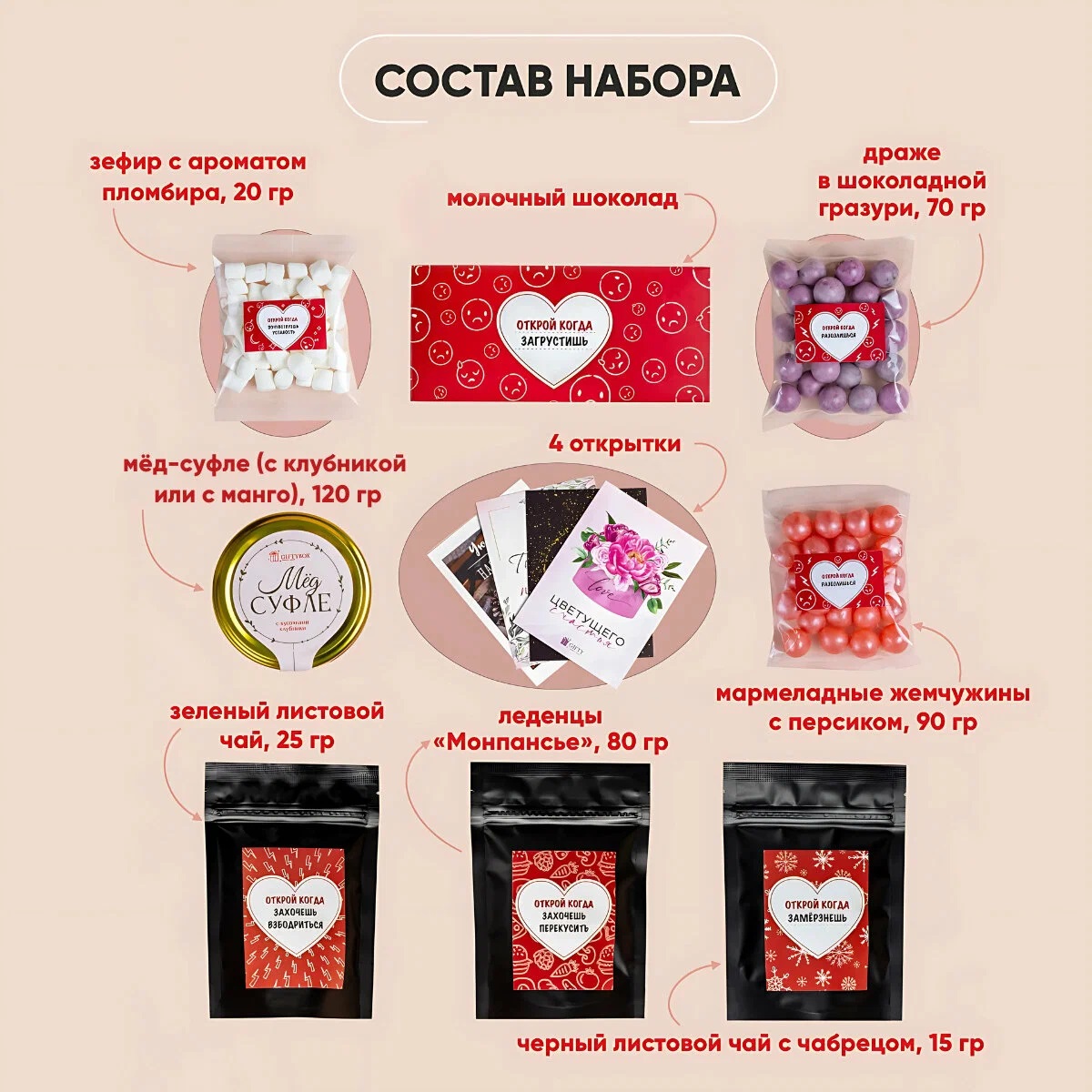 Внутри черный чай с чабрецом, зеленый китайский чай, крем-мед, шоколад и драже. Упаковано сразу в коробку, искать не придется отдельно. Такой весь нежно розовый