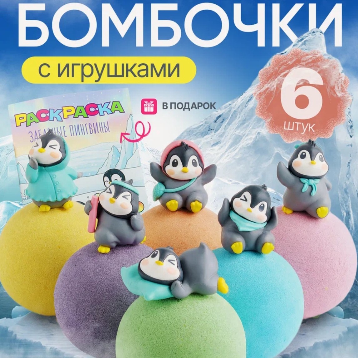 Шесть бомбочек, в каждой маленькая фигурка пингвина. Бомбочки разноцветные, когда бросаешь в воду шипят и пенятся, а потом игрушка выплывает.