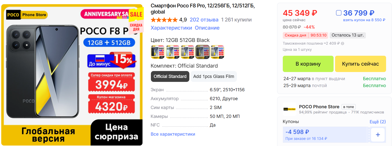 Poco F8 Pro, 12/512 ГБ, глобальная версия - 37122 ₽. Мощный аппарат для игр и тяжёлых задач, много памяти.