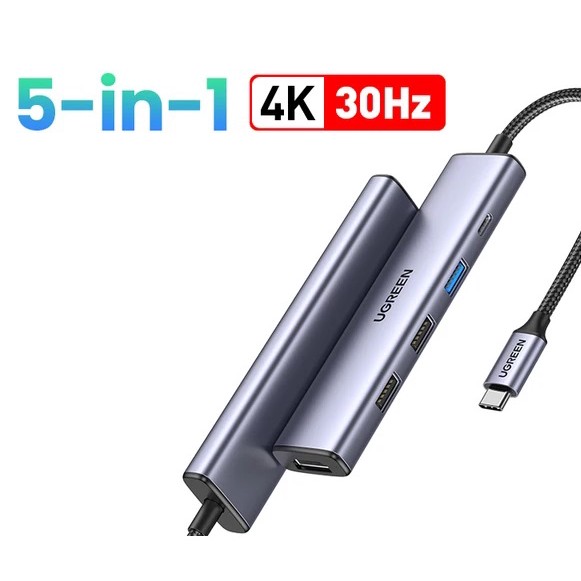 хаб UGREEN 5 в 1 за 920₽. Порты USB 3.0 с 5 Гб/с, 2хUSB 2.0, Type-C с 100 Вт и HDMI 4К 30 Гц