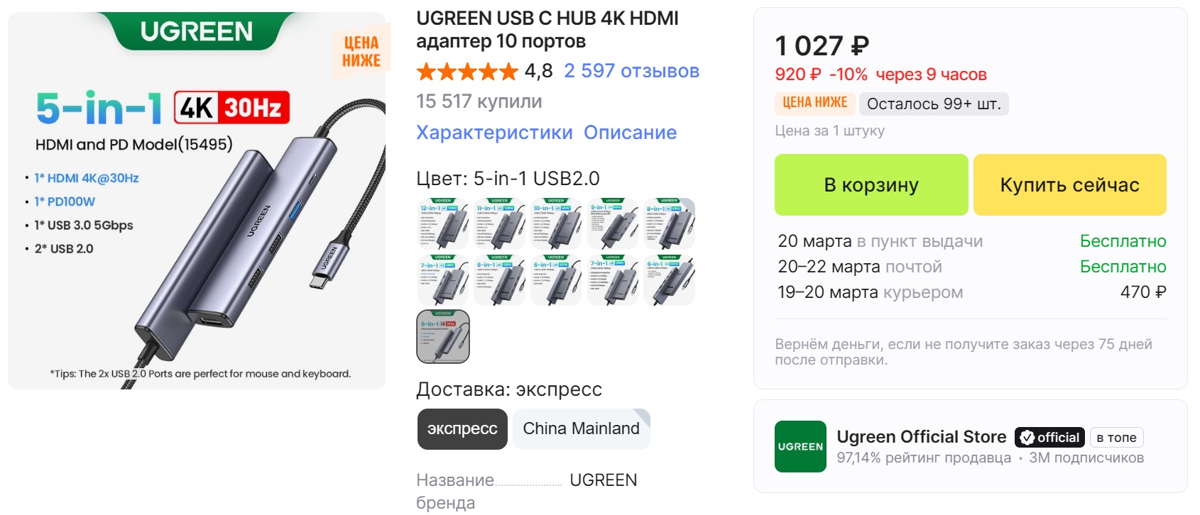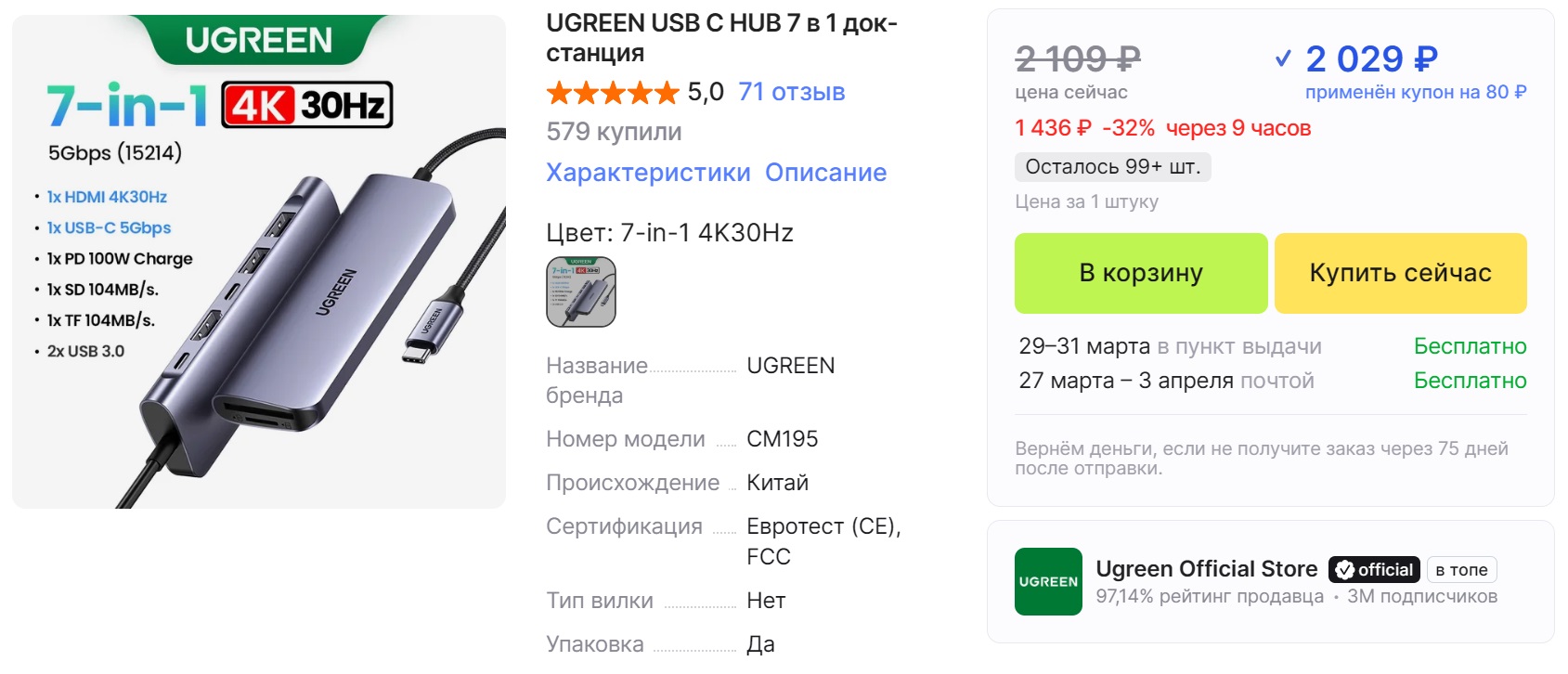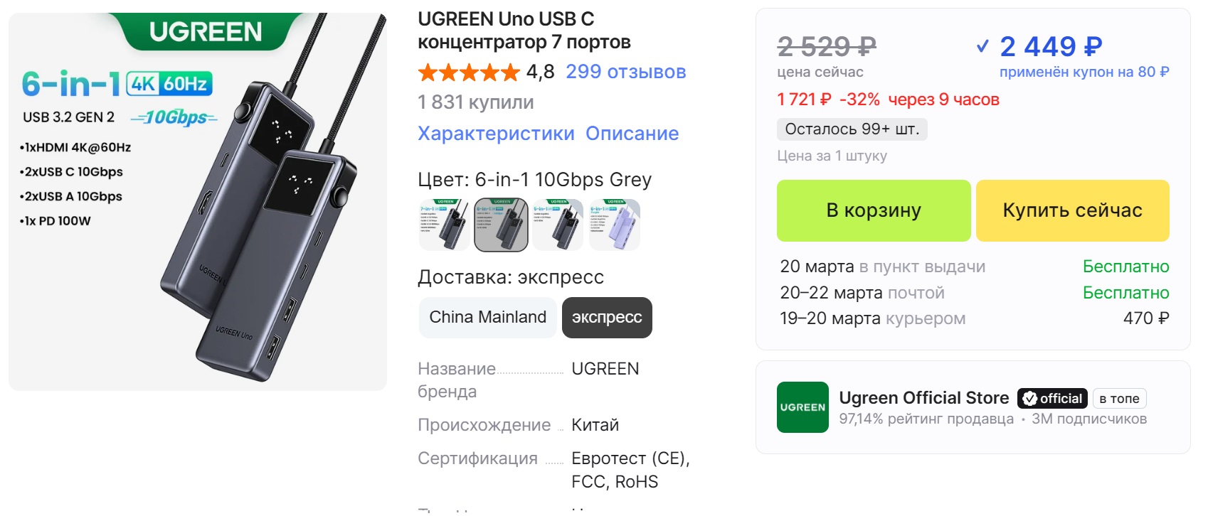 UGREEN Uno USB C концентратор 7 портов за 1721₽. Три порта USB 3.0, HDMI 4K + PD 100 Вт.