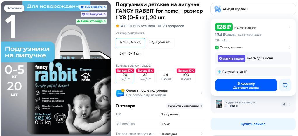 Отличная цена на подгузники для крох, выходит 6.4р за 1 шт. Ещё у меня есть 100 бонусов от продавца, если их списать, к оплате 96р за 20 шт - подарок!
