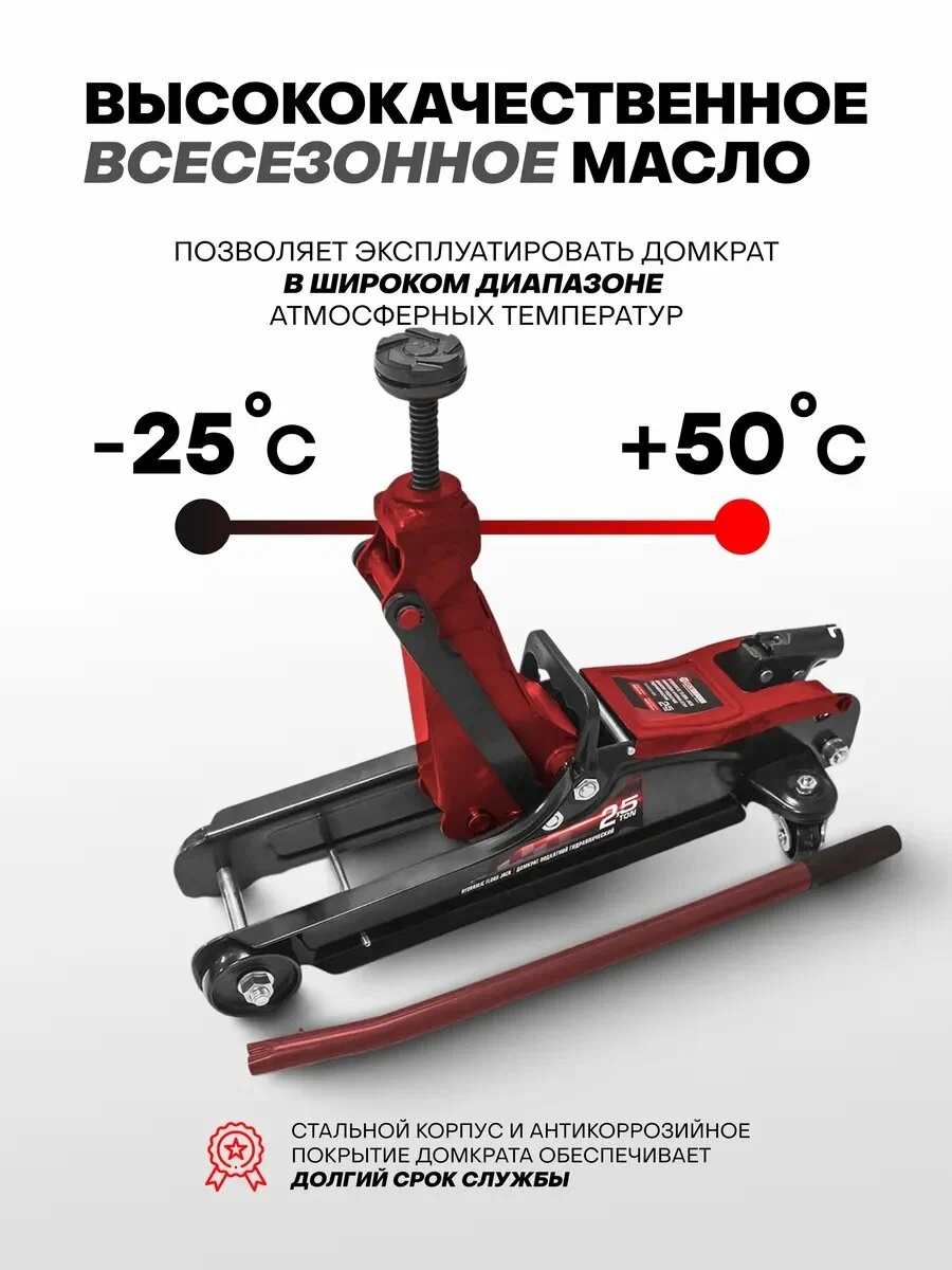 Цена отличная! Грузоподъёмность 2.5т, подойдёт для большинства легковых автомобилей и небольших внедорожников, высота подхвата 90 мм, высота подъёма 400 мм. Корпус выполнен из стали, усилен, есть предохвранительные клапана от перегрузки и плавного спуска.