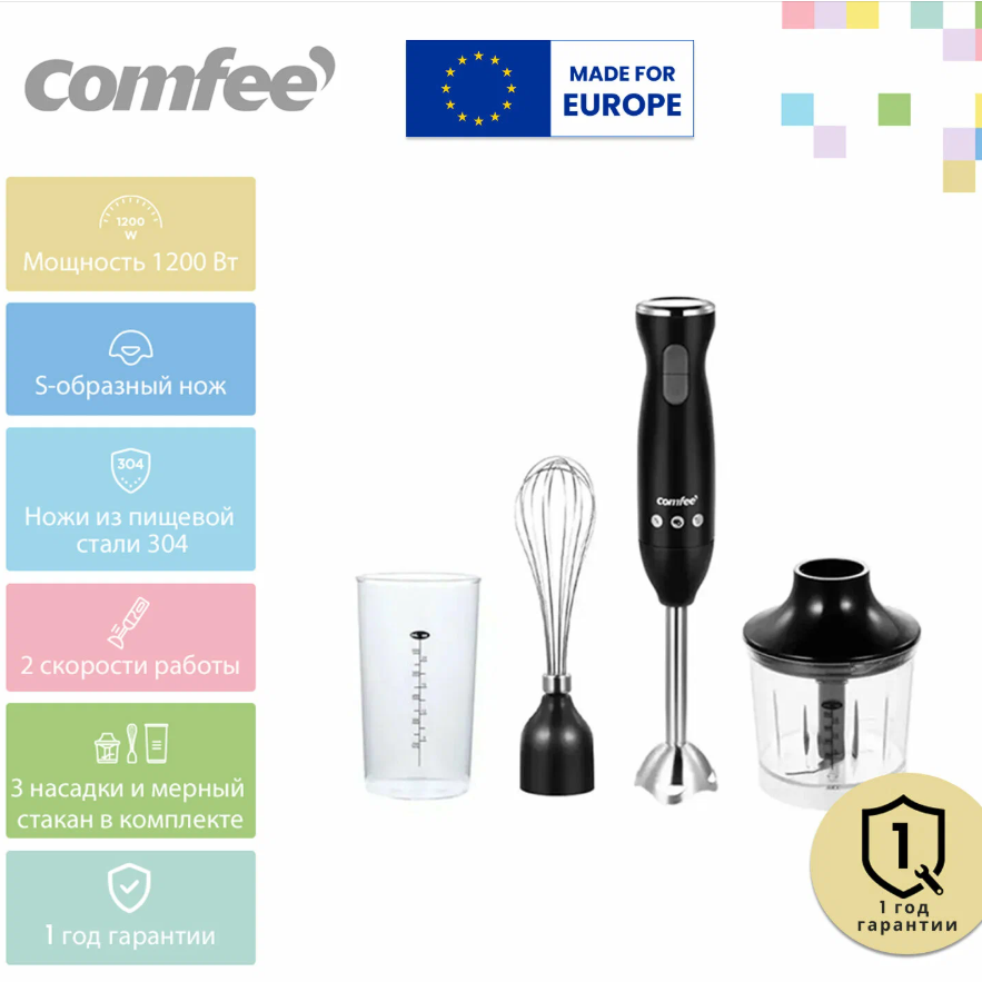 Цена хороша. С мощностью 1200 Вт с пластиковым корпусом и металлической погружной частью. Он имеет две скорости работы, управление которых осуществляется механическим способом. В комплект входят три насадки: основной измельчитель, венчик для взбивания и мерный стакан. Подходит для приготовления коктейлей, супов-пюре и соусов, а также для измельчения относительно твёрдых ингредиентов.