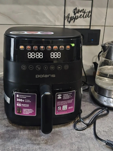 Объем чаши 6 литров - для семьи норм. Управление со смартфона через приложение Polaris IQ Home, 8 автопрограмм, но можно и настраивать. Говорят, готовит быстрее духовки. В комплекте две решетки: гриль и антипригарная, чтобы жир стекал. Понравилось, как на фотках выглядит