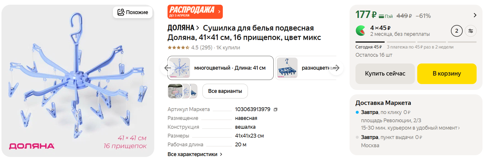 Сушилка для белья подвесная Доляна, 41×41 см, 16 прищепок - 177 ₽. Вешается на штангу, не мешается под ногами. Удобная штука.
