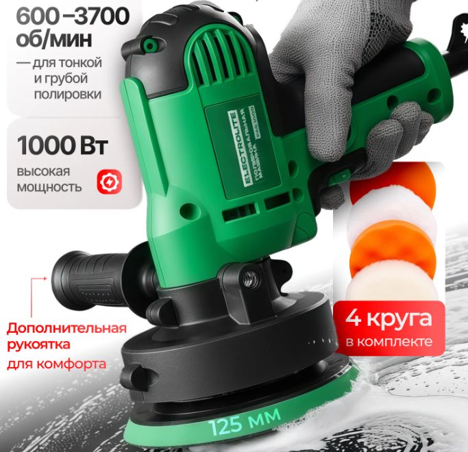 Мощность 1000 Вт, обороты от 600 до 3700. Диск 125 мм на липучке. Есть защита от перегрузок и стабилизация оборотов под нагрузкой. Кабель 1.5 м.