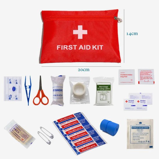 В комплект входит влагонепроницаемая сумочка 14х20 см, а также салфетки, пластыри, бинт, ножницы, пинцет и др.