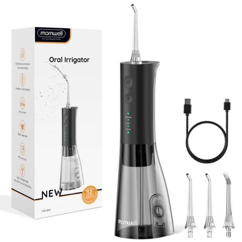 Штука полезная: 1800 пульсаций в минуту, давление воды 40-90 PSI - чистит межзубные промежутки и массирует дёсны. Вода из бачка на 300 мл, аккумулятор 1400 мАч, защита от воды IPX7 - можно в душе не бояться.