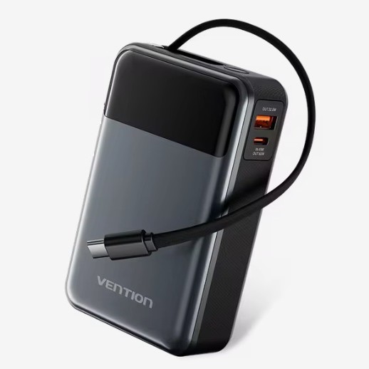 На AliExpress сейчас можно взять внешний аккумулятор от Vention на 65 Вт. Ёмкость 20 000 мАч. Главная фишка - встроенный USB-C кабель длиной 0,25 м, который выдвигается и затягивается обратно: потянули - отрегулировали длину, потянули ещё раз - убрали. Никаких запутанных проводов в сумке. У него два порта: USB-C выдаёт до 65 Вт - этого хватит, чтобы заряжать ноутбук. USB-A - до 22.5 Вт для телефонов и другой мелочи. На корпусе светодиодный дисплей, показывает остаток заряда. Поддерживает кучу протоколов быстрой зарядки: PD 3.0, QC 4/3/2, AFC, SCP, FCP, PPS. Удобная вещь для тех, кому нужно заряжать и ноутбук, и телефон в дороге без лишних проводов.