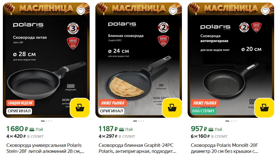 В каталоге есть сковороды, наборы посуды, кастрюли, отзывы положительные.