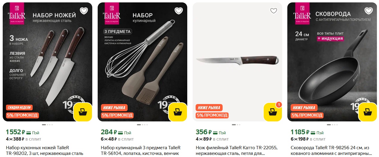 Практичкая и качественная посуда и кухонные аксессуары TalleR по выгодным ценам. Есть ножи, сковороды, наборы для готовки и многое другое.