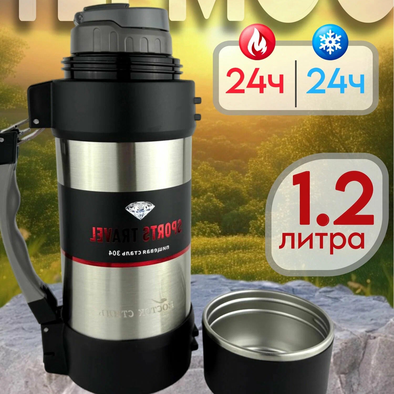 Термос походный 1.2л нержавеющая сталь за 843₽, сохраняет температуру напитков до 24 часов.