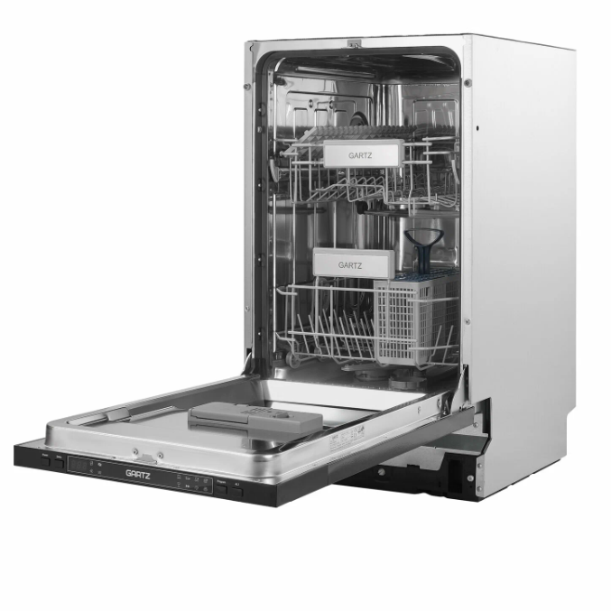 Если тебе нужна неболшая, но функциональная посудомоечная машина, то эта модель GARTZ - хороший выбор для маленькой кухни. Она встраивается и у неё ширина всего 45 сантиметров, так что она легко поместиться в шкаф. Внутри у неё есть место для примерно 9 стандартных комплектов посуды, можно даже запустить половинную загрузку, если накопилось немного.