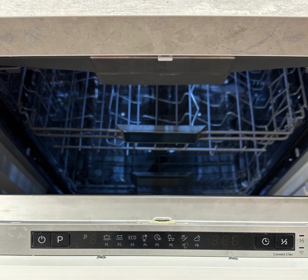 Модель полноразмерная, на 60 см. Встраиваемая полностью, прячется за фасадом, снаружи только панель управления. Цвет бежевый металлик, под кухню подобрали норм. Вес 33 кг, таскать одному тяжеловато, звал напарника.