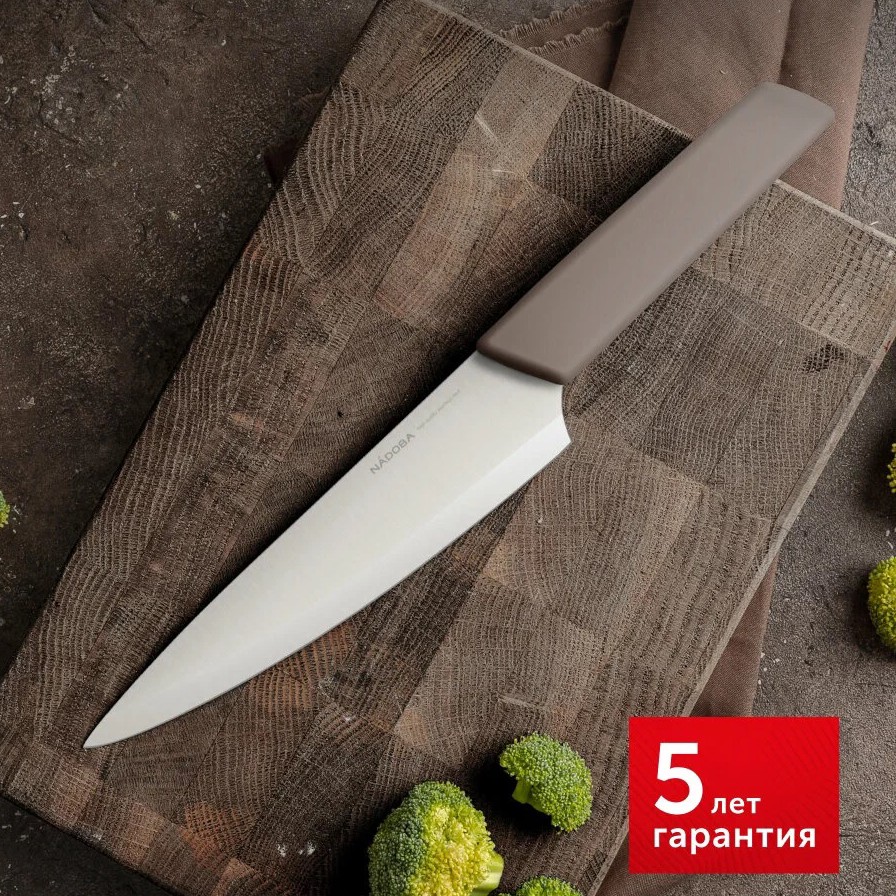Нож классический поварской для универсального использования, подходит для нарезки мяса, рыбы, овощей и других продуктов. Сделан из качественной нержавеющей стали, остро заточен и долго держит остроту. Твёрдость лезвия 52-54 HRC, достаточно гибкий, не хрупкий, легко правится мусатом.