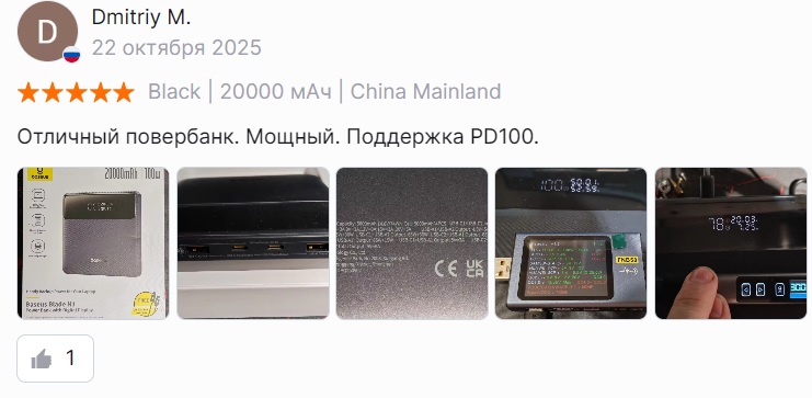 Ёмкость 20 000 мАч, мощность 100 Вт - этого хватит, чтобы зарядить ноутбук и несколько раз телефон. Порты: два USB-C (оба на 100 Вт) и два USB-A (по 30 Вт), можно подключать несколько устройств одновременно. Поддерживает быстрые зарядки QC, PD, PPS. На корпусе цифровой дисплей с уровнем заряда и параметрами. Есть защита от перегрева и перегрузки. За такую цену отличный вариант!
