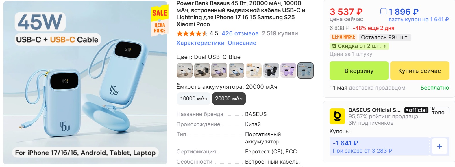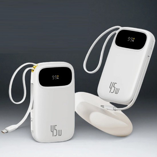 Нашел тут повербанк неплохой. Baseus на 20000 мАч, со встроенными кабелями Lightning и USB-C, и сделали так, что они же как ремешок для переноски работают.