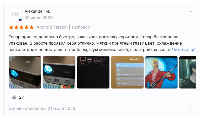 Проецирует изображение диагональю до 150", есть автофокусировка и автокоррекция, мощность звука 5 Вт, 1/8 ГБ памяти, ОС Android (можно ставить приложения). Разрешение 1920x1080, яркость 18000 люмен и контрастность 15000:1. Есть Wi-Fi, Bluetooth, Miracast, AirPlay, Ethernet, USB, HDMI порты.