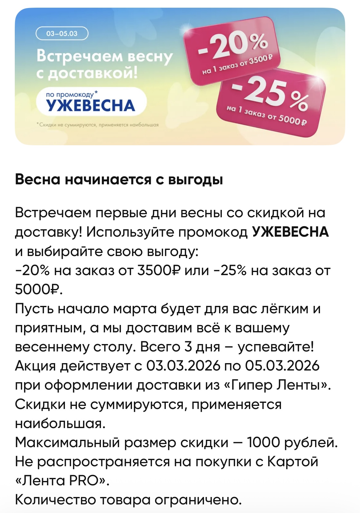 Нашла новый промокод в приложении. Работает еще 2 дня. Дает скидку: -20% на заказ от 3500₽ или -25% на заказ от 5000₽.