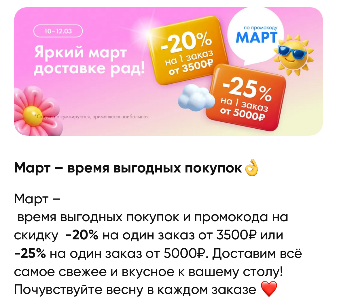 Дает скидку: -20% на заказ от 3500₽ или -25% на заказ от 5000₽.