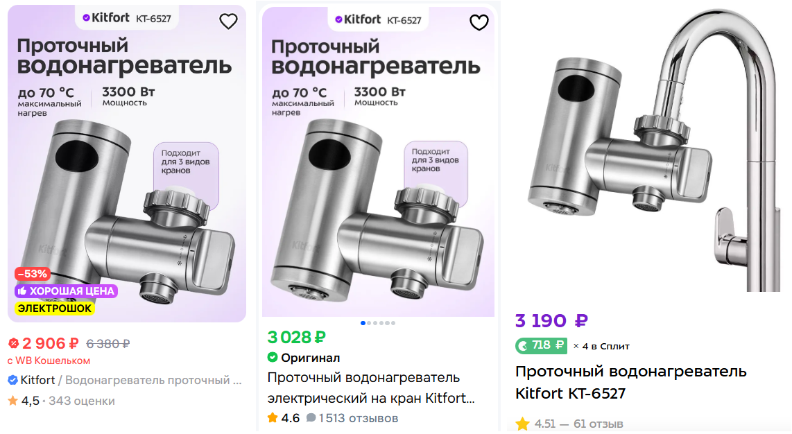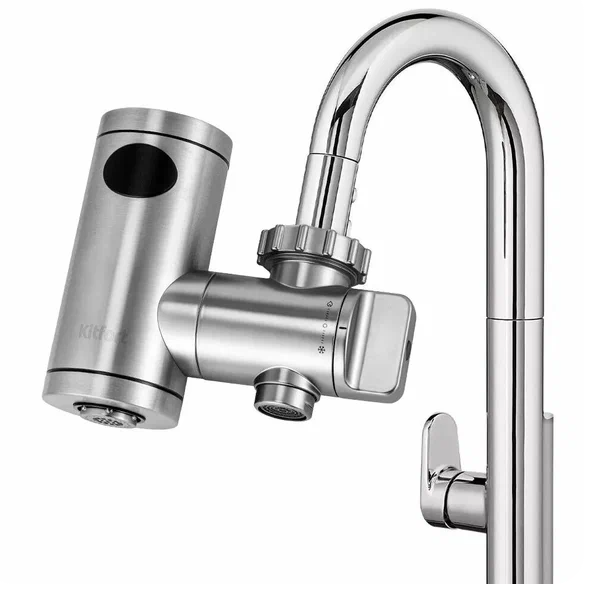 Крепится прямо на кран, в комплекте муфты под разную резьбу, переходники, прокладки - подойдёт почти к любому смесителю. Нагревает воду до 70 градусов, на корпусе дисплей и регулятор температуры.