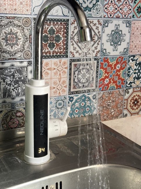 Нашла на Маркете проточный водонагреватель NEOLINE OneTap за 1868₽. Это вообще не отдельный прибор, а полноценный смеситель, который сам греет воду. Ставится на раковину вместо обычного крана.