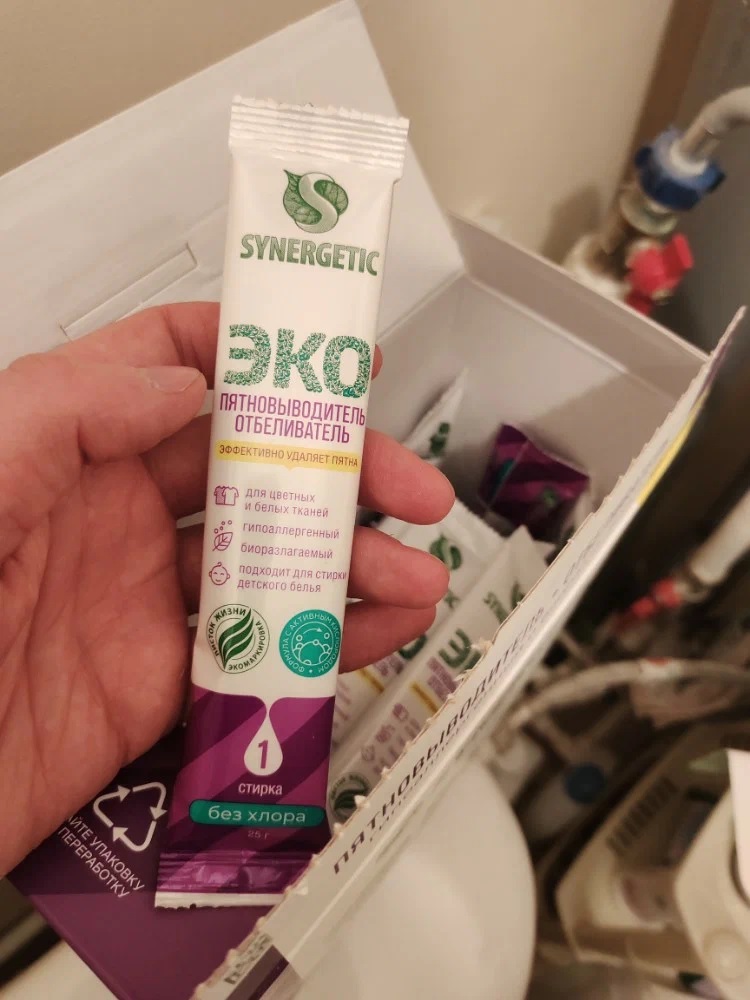 Подходит для удаления пятен с натуральных и синтетических тканей, не содержит хлора, можно использовать для предварительной обработки, замачивания, ручной и машинной стирки.