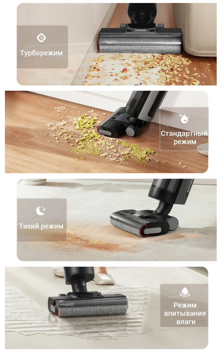 четыре режима: стандартный, турбо, тихий и для сбора жидкостей