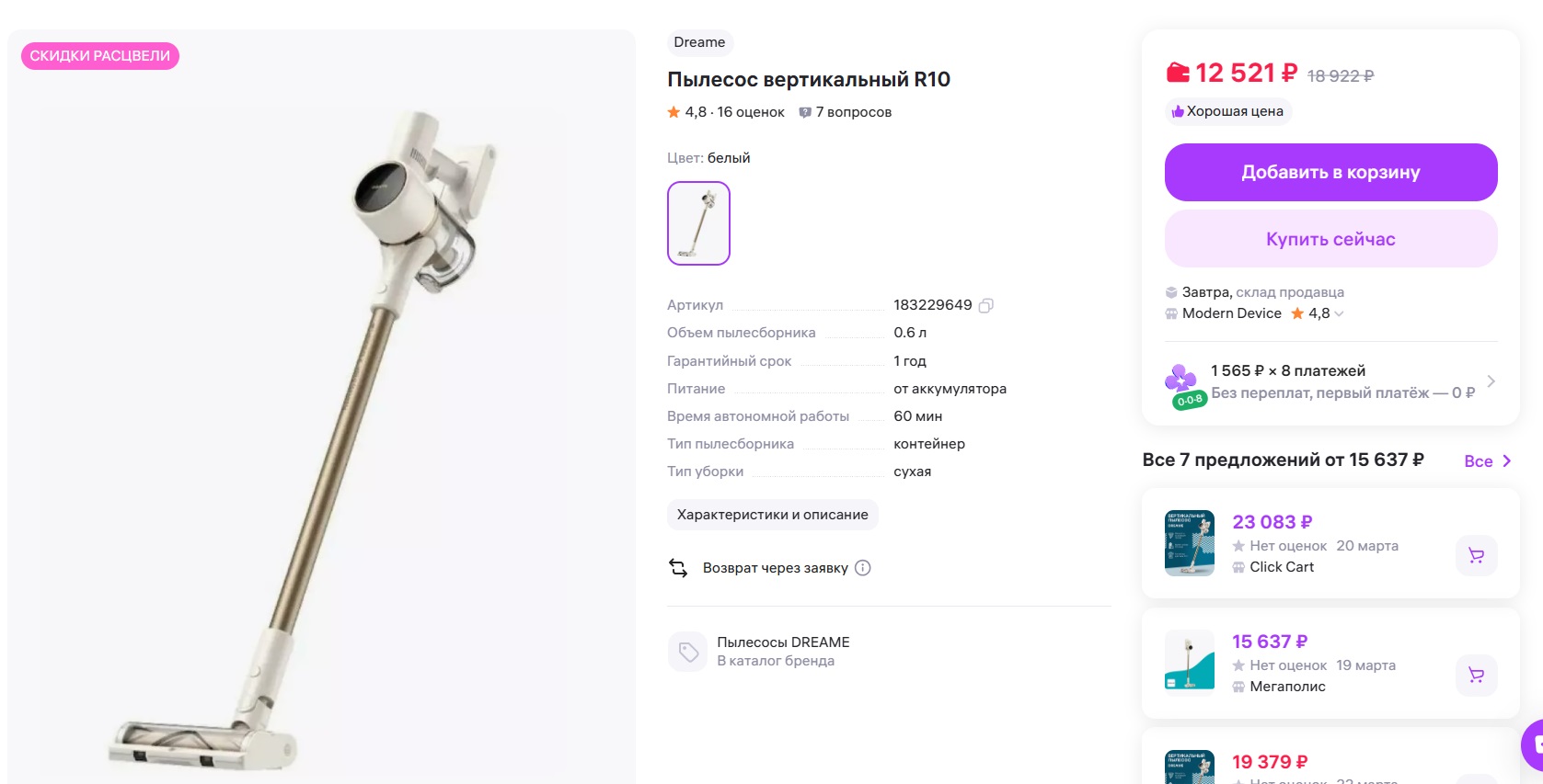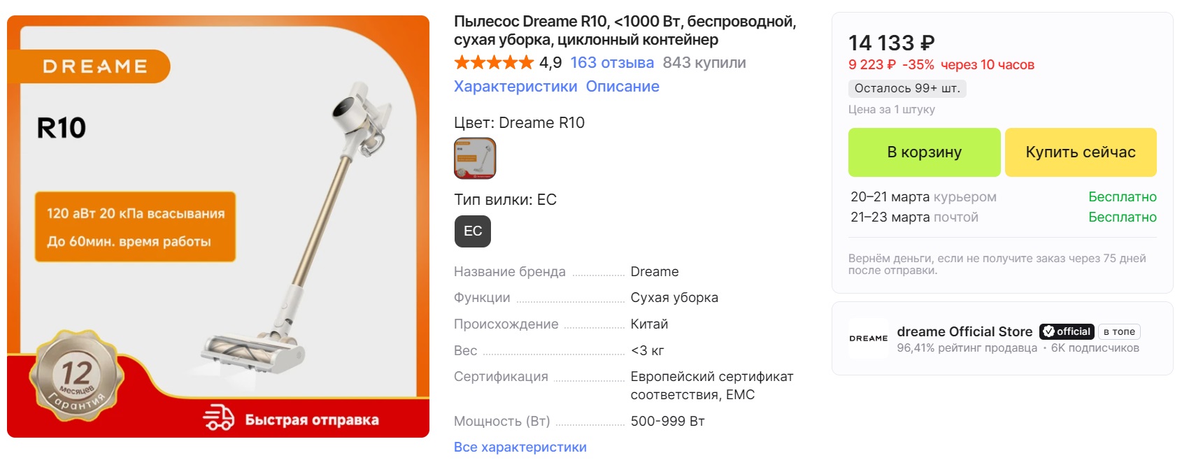 Недавно приобрел себе на Алике этот беспроводной пылесос. На распродаже его можно заказать будет за 9223₽.