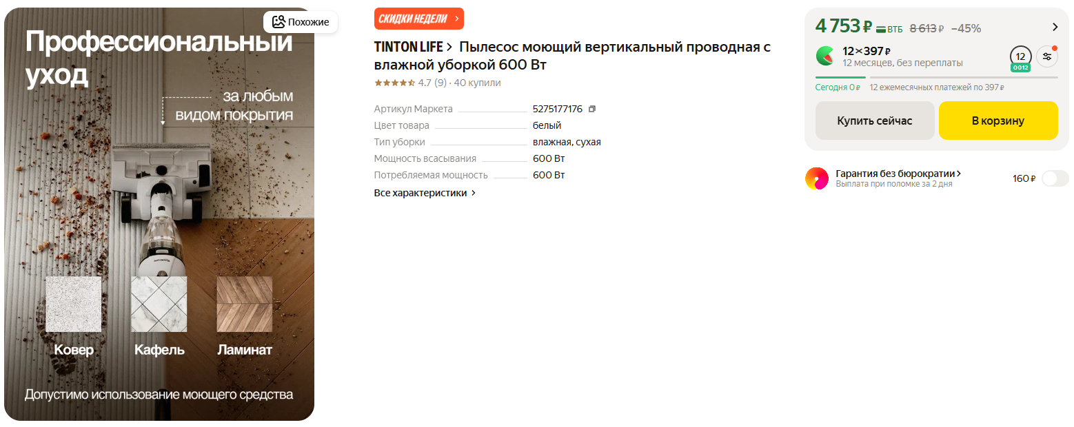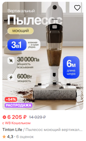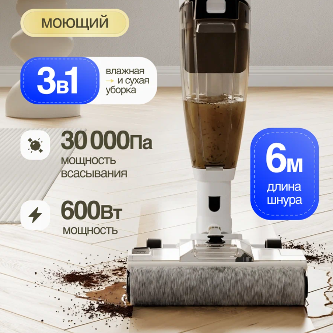 Цена огонь для моющего пылесоса, правда проводной, но зато не надо заряжать. Длина шнура 6 м, мощность 600 Вт, пылесборник 0.6 л. Убирает сухой мусор и влажный - можно мыть полы и собирать пролитую жидкость. Подходит для любого напольного покрытия, в комплекте насадки с мягким валиком и для сбора жидкости, фильтр тонкой очистки.