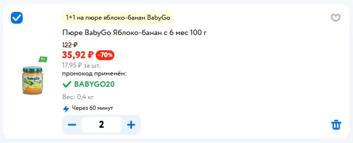 1+1 на пюре BabyGo (скидка применится в корзине автоматически, надо добавить 2 штуки)