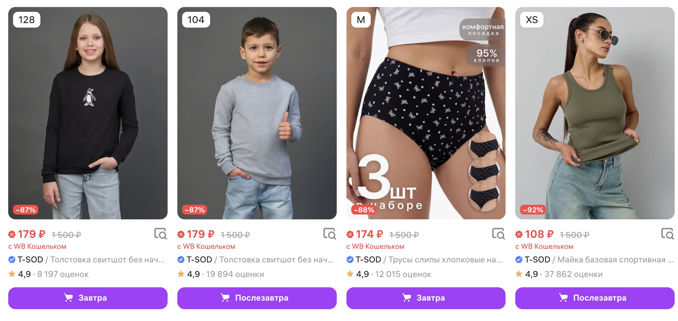 Размеров осталось очень мало! Ставь сортировку по нужному размеру. В каталоге майки от 108₽, женское нижнее белье от 174₽, детские толстовки от 179₽ и многое другое по низким ценам.