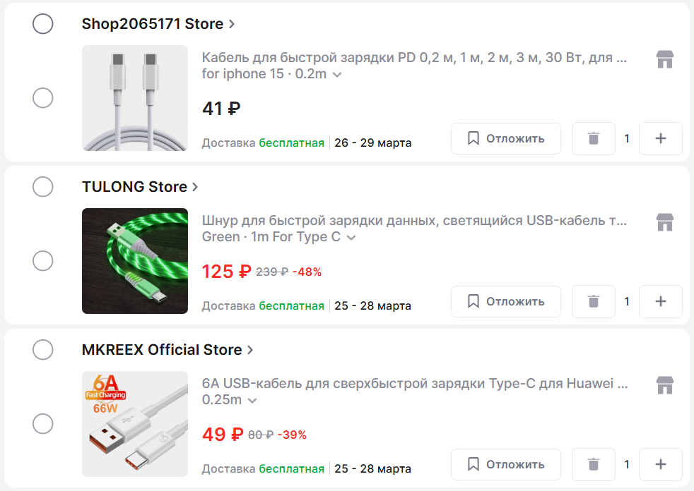 Подборка Type-C кабелей с поддержкой быстрой зарядки для примера: