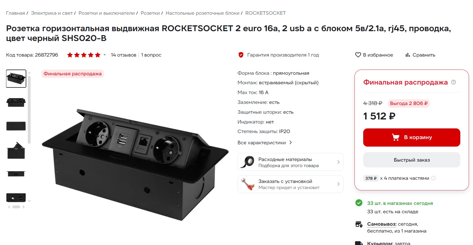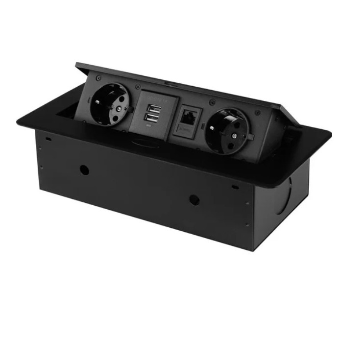 Ищу себе подобное что то на кухню. Но такой вариант больше для рабочего стола. Тут есть два евро разъема, два USB-A порта с током 2.1А и даже RJ45 для интернета.Устанавливается в столешницу, открывается под углом. Указана металлизированная отделка, но я не понял что за покрытие в итоге