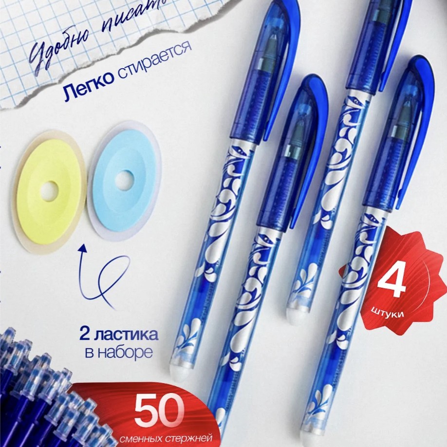 В наборе 4 ручки, 50 стержней и 2 ластика. Хватит надолго!