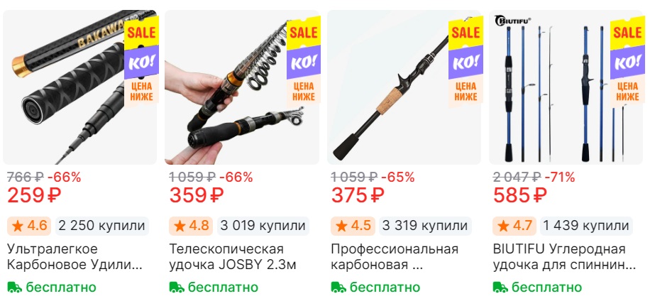 В разделе рыболовных удочек из каталога на AliExpress есть огромный выбор моделей по сниженным ценам при покупке через комбо-корзину. Минимальная сумма заказа в комбо - 1000₽, но товары приходят быстрее стандартной доставки. Сравнили по маркетплейсам - цены на Алишке гораздо выгоднее, плюс доставка порой гораздо быстрее, чем через Ozon или ВБ заказывать и также ждать с Китая.