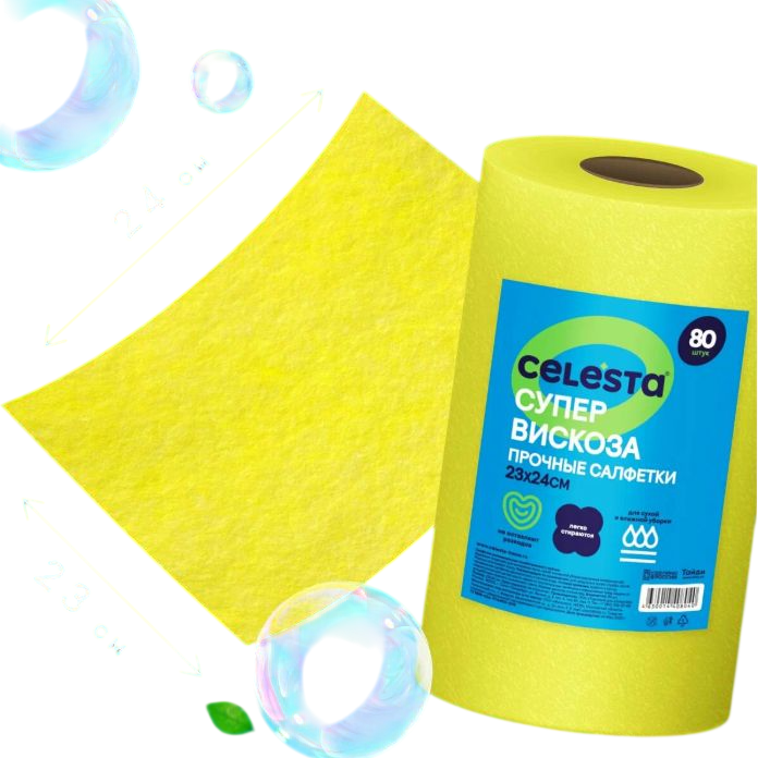 Из вискозы, без ворса - не оставляют разводов. Плотные (80 г/м²), размер 23х24 см. Можно мыть и сухо, и мокро. Рулон с перфорацией - отрываешь сколько надо. Выдерживают много стирок.