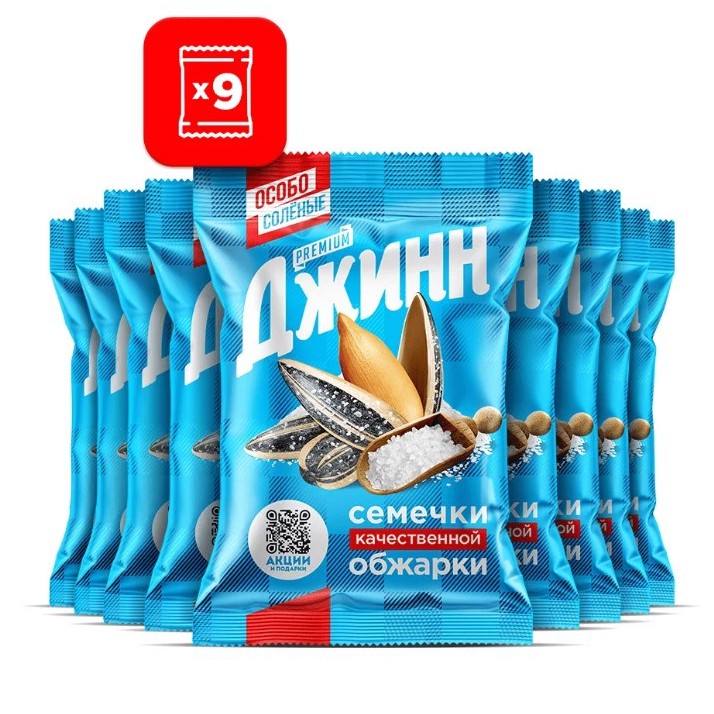 Семечки «Солнечный Великан» (ТМ «Джинн») особо соленые, полосатые, 9 × 100 г - 509₽
