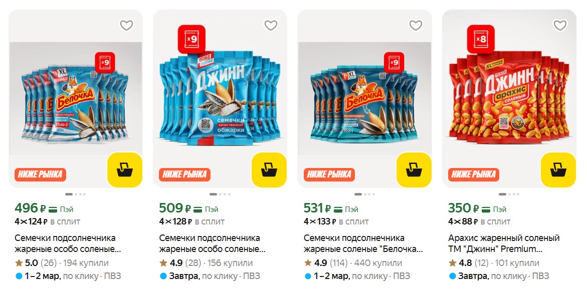 Самая низкая цена за килограмм - у «Молодежных» от Мартина (409₽/кг). Остальные варианты чуть дороже, но там семечки фасованы отдельными пачками, что удобно, если брать с собой или не хотите хранить открытый пакет.